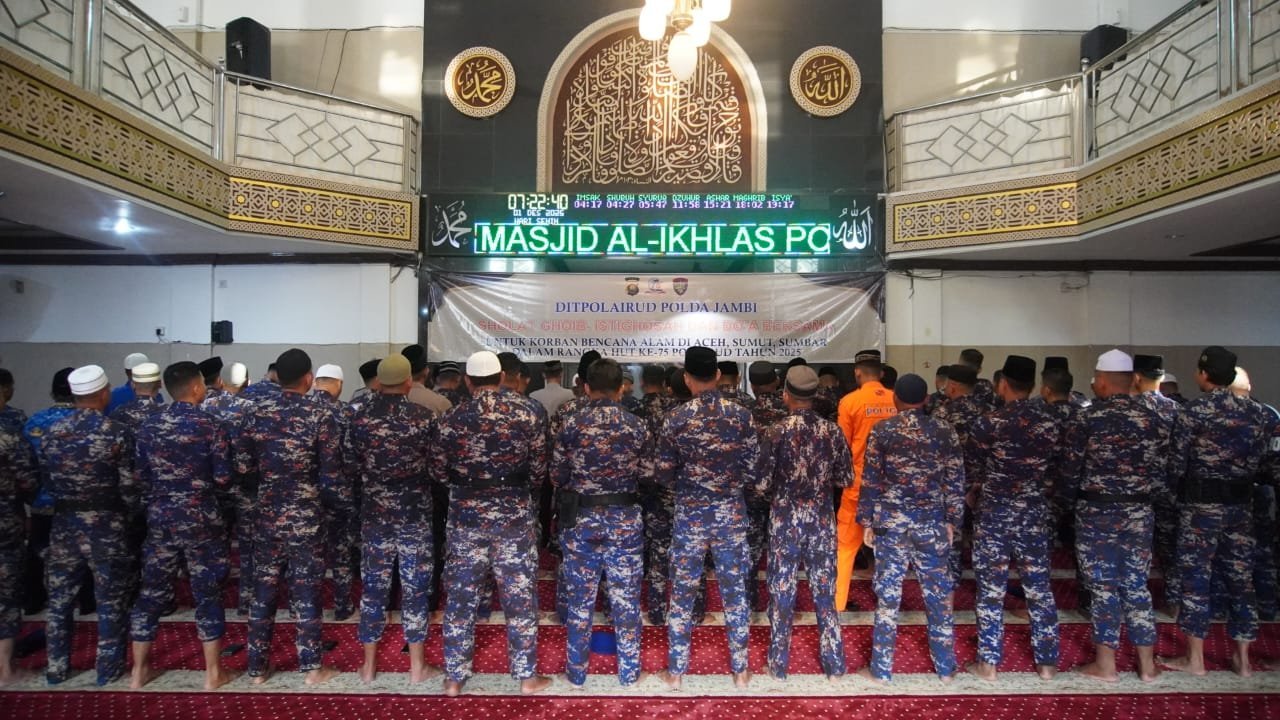 Infodaily.co.id –  Dalam rangka memperingati HUT ke-75 Polairud tahun 2025, Ditpolairud Polda Jambi melaksanakan Sholat Ghaib, Istighosah, dan Doa Bersama di Masjid Al-Ikhlas Polda Jambi, sebagai bentuk empati atas musibah bencana alam yang menimpa wilayah Aceh, Sumatera Utara, dan Sumatera Barat. (01/12/25)