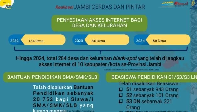 Pada sektor pendidikan dan penguatan sumber daya manusia, Pemprov Jambi hingga 2024 telah menyediakan akses internet bagi 284 desa dan kelurahan blank spot yang tersebar di 10 kabupaten dan kota. Program ini ditujukan untuk memperluas akses informasi dan mendukung pembelajaran berbasis digital, terutama di wilayah terpencil.